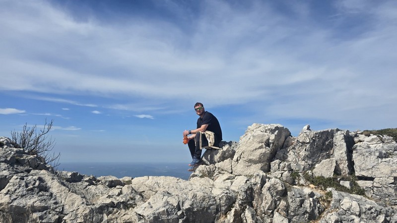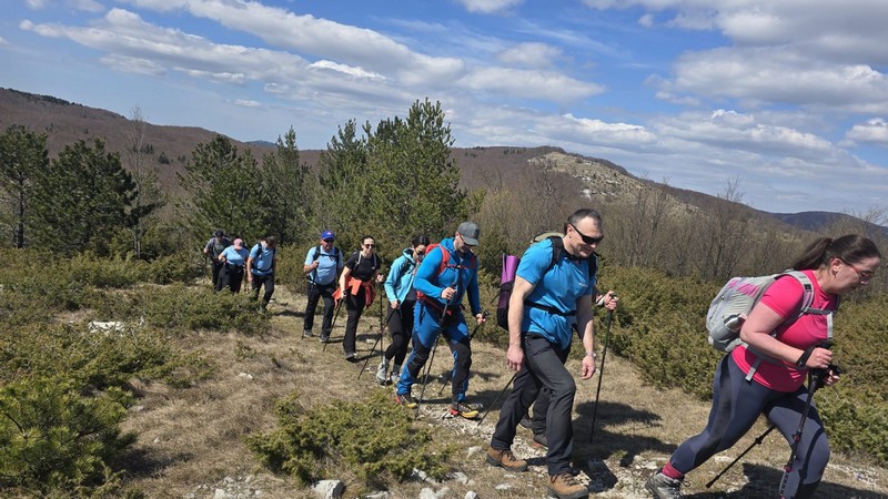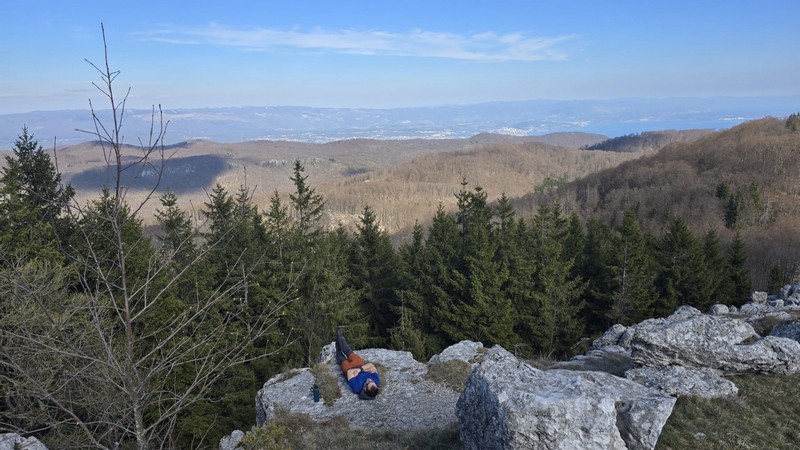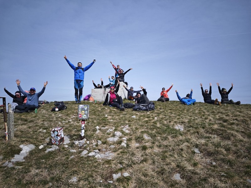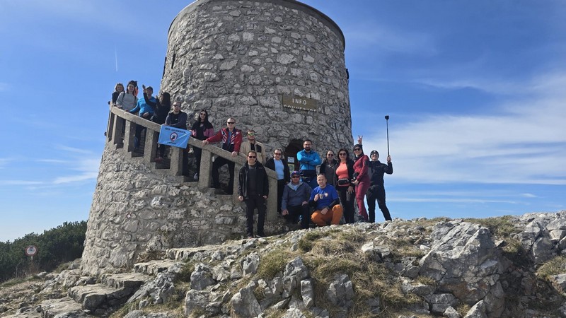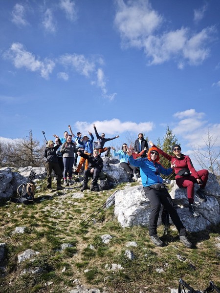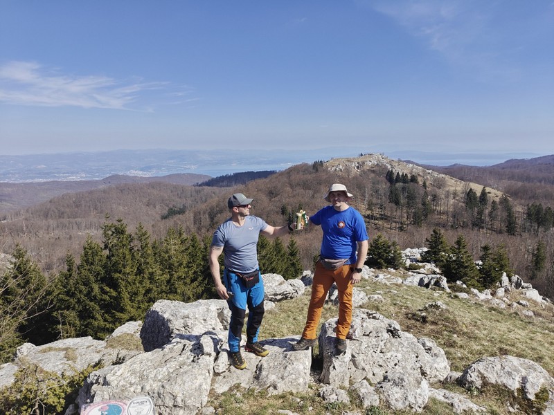 Nakon doručka, s ruksacima, vrećama za spavanje i štapovima uputili su se sada već poznatom stazom natrag u Brgudac. Na parkiralištu sreli su djecu iz obližnjih mjesta, koja zajedno s roditeljima i tetama pohode stazu kojom su mi prošli. Oduševili su se time što se ovdje već u ranoj dobi pripremaju za boravak i uživanje u prirodi. Nakon kratke stanke put su nastavili prema Gornjem Jelenju, gdje im je cilj bio planinarska staza koja vodi na vrh Tuhobić 1109 mnv. Od glavne ceste staza ih je odvela najprije pored vikendica, a zatim kroz šumu. Iako na internetu stoji da je staza uredno uređena i uzorno markirana, svi su se složili da to baš i nije tako. Da bi morali poraditi na tome da to bude onako kako i piše?! Staza u početku vodi makadamskim putem da bi se većim dijelom nastavila kroz bukovu šumu. Stigavši na sami vrh…..pogled je ono….wauuu…pogled na more!!!! Pogled na otoke Krk i Cres, na cijeli Riječki zaljev, na grad Rijeku te autocestu s obje strane tunela. S druge strane na kontinentalni dio i Sloveniju te Alpe u daljini. Sav trud koji su uložili da bi došli do vrha, nije bio uzaludan. Nakon svega slijedilo je fotografiranje, snimanje spota te stroga naredba vodiča kako svi moraju raditi sklekove, bez pogovora. Nikome nija palo na pamet da se odupire šaljivoj naredbi, već su svi zdušno prionuli pumpanju sklekova kao nagradi za kraj ovog predivnog izleta.