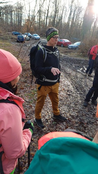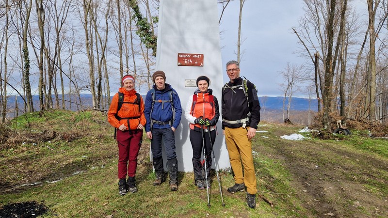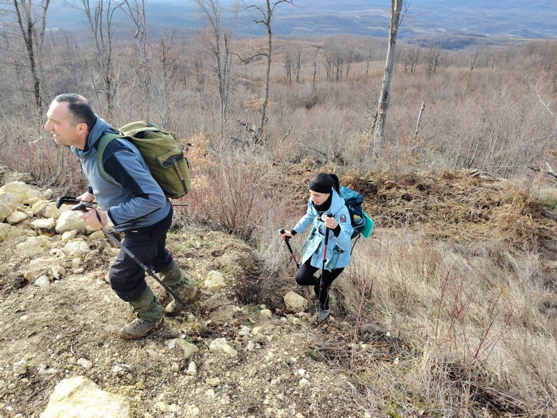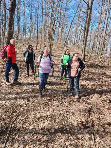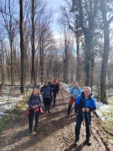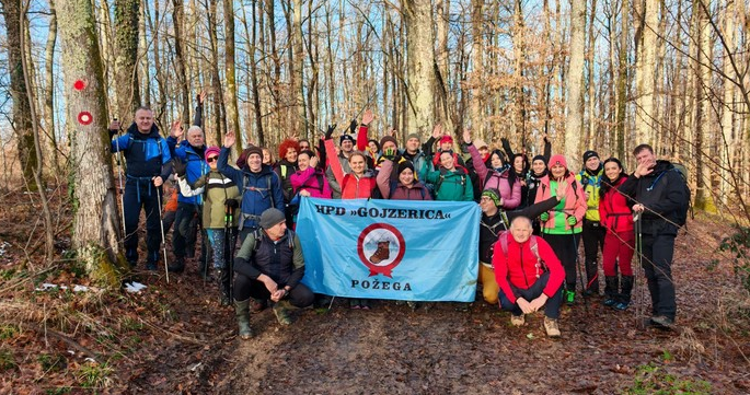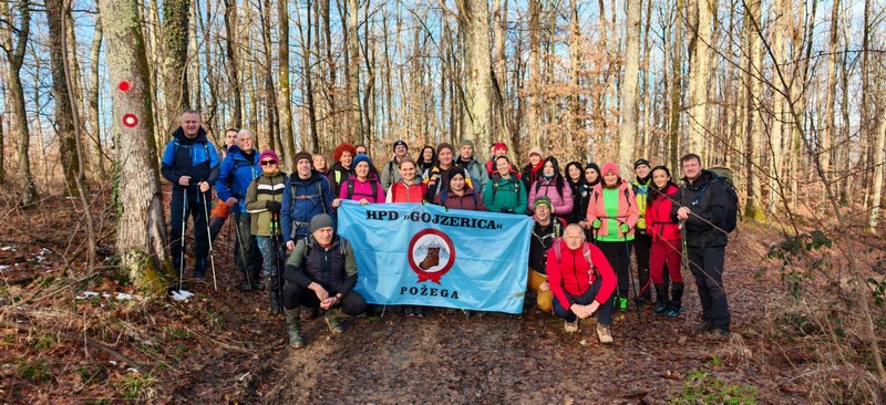 Nakon što smo konsolidirali redove od 32 hodačkih entuzijasta (bilo nas je s više strana; šestero iz Podružnice Oriovac, troje gostiju iz PD Dilj Slavonski Brod te svi ostali iz matične i brojne baze Gojzerice, uz napomenu da su pola bili polaznici planinarske škole) te nakon uvodnog i obveznog vodičkoga govora krenuli smo put Slavonake planinarske obilaznice u smjeru zapada kako bi prehodali u komadu Požešku i Babju Goru. Samim ranojutarnjim startom pratilo nas je jedno od posljednjih ovosezonskih idiličnih zimskih jutara, onakvo divno jutro kakvo mi planinari volimo da nas prati uz našu dinamičnu šetnju ka očekivanim vrhovima. Nakon višetjednih učestalih padavina gazili smo vrlo blatnjavo tlo, što nije predstavljalo problem vrlo dobro opremljenim hodačima. Kako smo se penjali ka prvom vrhu Maksimov Hrast tako smo bilježili tanki sloj jučer napadaloga snijega koji se zadnjim naporima opirao izlazećem suncu. Hodajući tako hrptom bacali smo poglede kroz ćelave krošnje stabala ka Papuku, gdje su se nazirali njegovi snježni vrhovi duž cijeloga masiva ka Krndiji. Ogledavajući se na južnu stranu vidjeli smo uglavnom kroz nizinsku maglu dio Brodske-posavine te brojne zasnježene planinske vrhove diljem prekosavlja.”