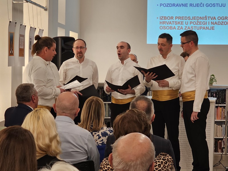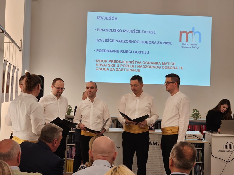 Čestitke na uspješnom radu u 2025.godini Ogranku Matice hrvatske u Požegi uputili su gradonačelnik prof.dr.sc.Borislav Miličević, zamjenik županice Ivan Radošić i predsjednik Matice hrvatske Damir Zorić. U glazbenom dijelu programa nastupila je Klapa sv.Lovro.