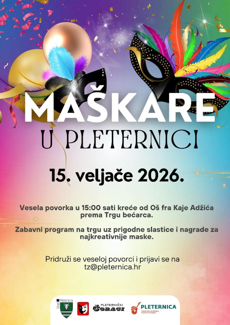 Maškare će u nedjelju ‘vladati’ i u Pleternici. Vesela maskirana povorka krenut će u 15 sati od škole ulicama grada do Trga bećarca gdje će se održati prigodni program. Ponuđene će biti razne slastice a izabrat će se i naklreativnije maske.