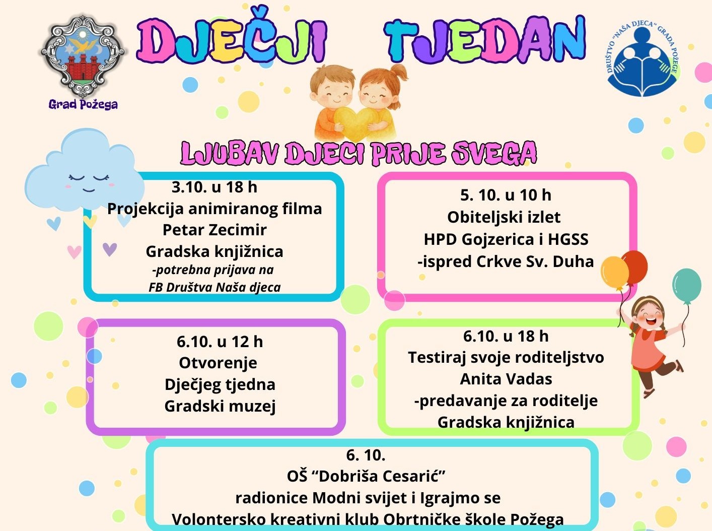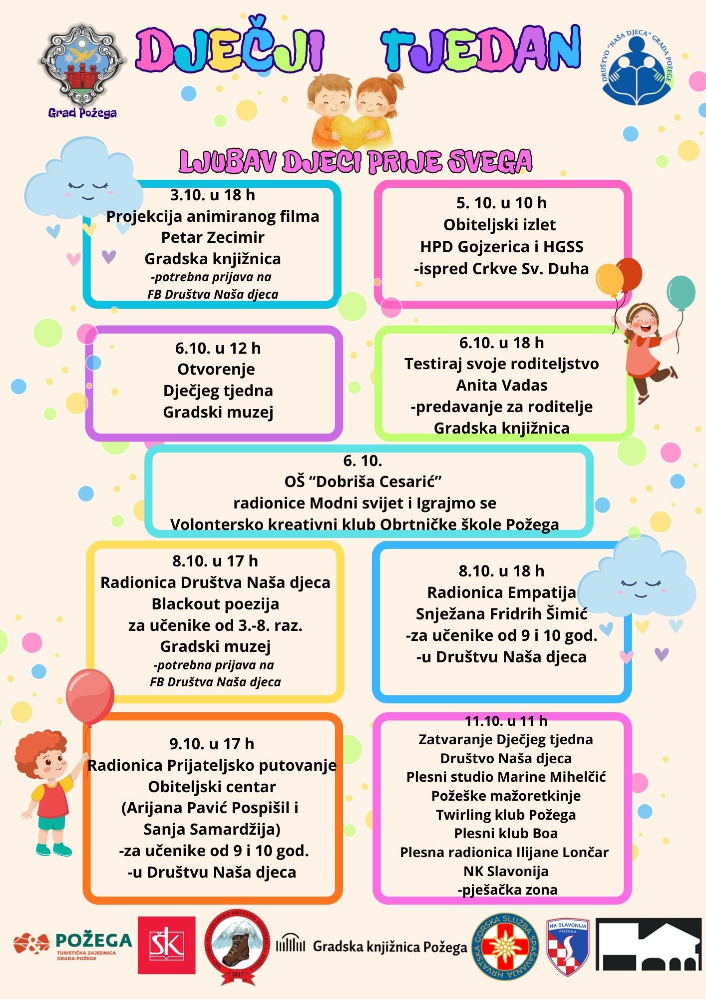 Dječji tjedan u Požegi, pod sloganom “Ljubav djeci prije svega”, počinje sutra, u petak 3. listopada, projekcijom animiranog filma Petar Zecimir u Gradskoj knjižnici Požega od 18 sati. Nastavlja se obiteljskim izletom HPD-a Gojzerica i HGSS-a Požega u nedjelju 5. listopada u 10 sati (okupljanje ispred crkve Sv. Duha).