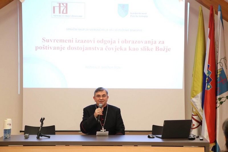 Jučer je u Dvorani sv. Terezije u Požegi održan stručni skup za vjeroučitelje koji djeluju u školama na području Požeške biskupije na temu: „Suvremeni izazovi odgoja i obrazovanja za poštivanje dostojanstva čovjeka kao slike Božje“. Prisustvovao mu je i požeški biskup Ivo Martinović.