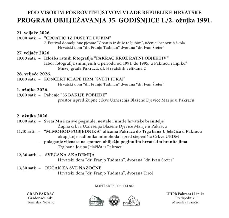 Središnje obilježavanje 35. obljetnice početka Domovinskog rata biti će održano u ponedjeljak 2. ožujka kada će najprije u župnoj crkvi UBDM u Pakracu s početkom u 10 sati biti služena sveta misa za sve poginule hrvatske branitelje.