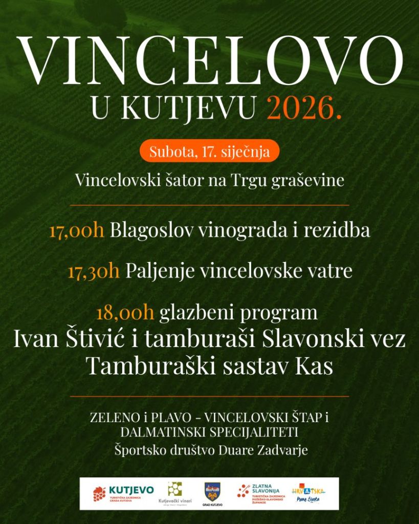 Pozivamo vas na proslavu tradicionalnog Vincelova 2026., koja će se održati u subotu, 17. siječnja, na Trgu graševine u Kutjevu. Program započinje u 17 sati blagoslovom vinograda i simboličnom rezidbom vinove loze, čime se i službeno označava početak radova u kutjevačkom vinogorju.